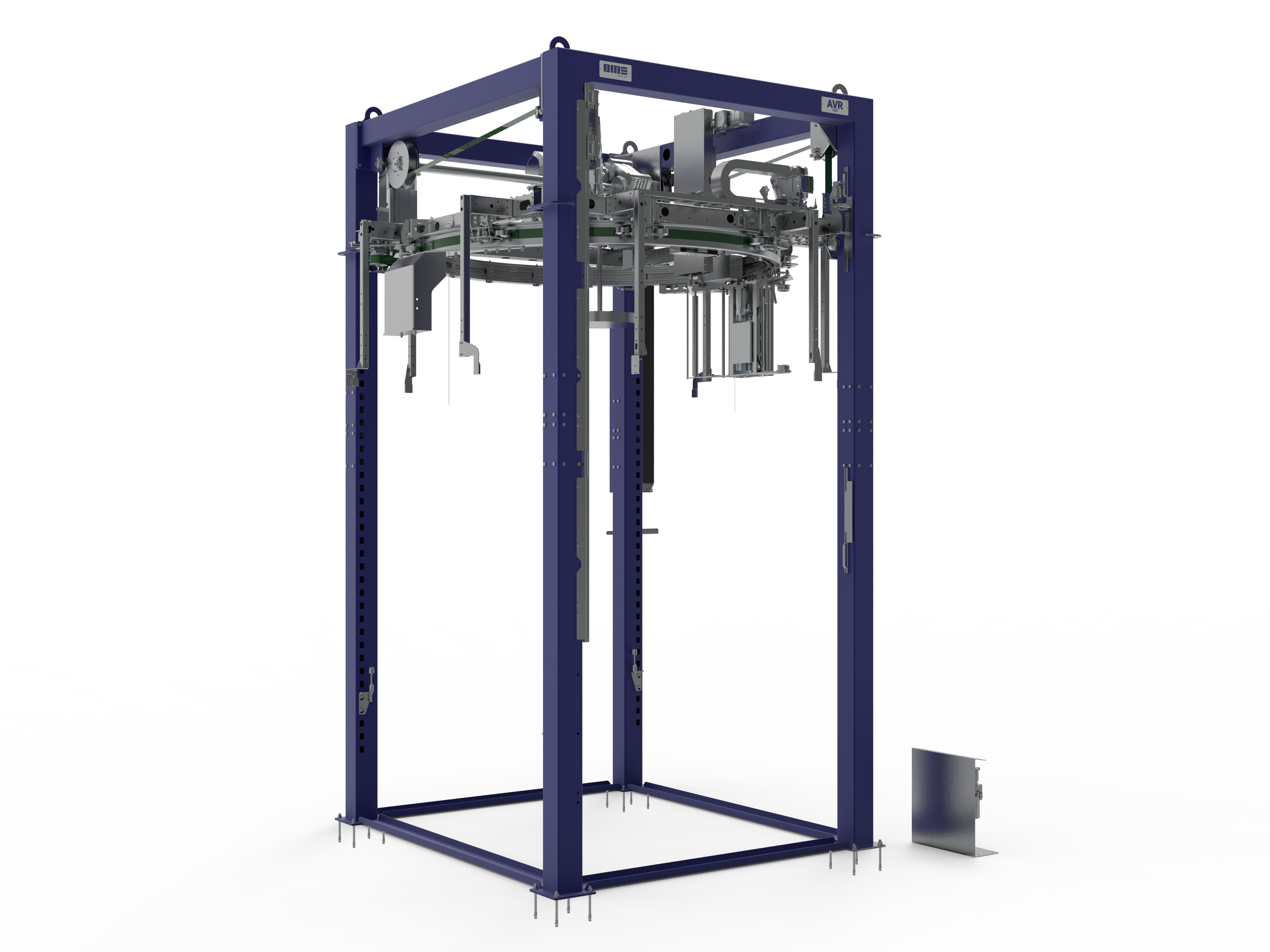 The AVR1000 is a rotating ring wrapper, featuring a rotating ring supported on rubber wheels. It is primarily used in the paper, cardboard, ceramics, fruit, bricks, wood, can and bottle, logistics, and glass industries. The machine can handle palletized and non-palletized products on automatic lines. It is equipped with a motorized pre-stretch system, and the welding and cutting unit can be either an incandescent lamp or a node unit. The AVR1000 can also be fitted with a small press, a top-sheet dispenser, and an adapter.